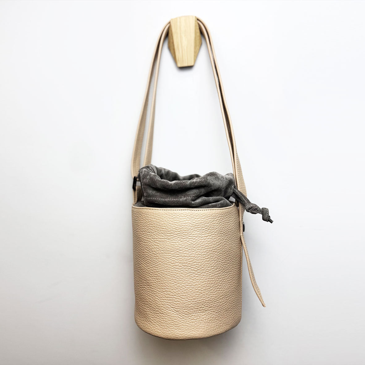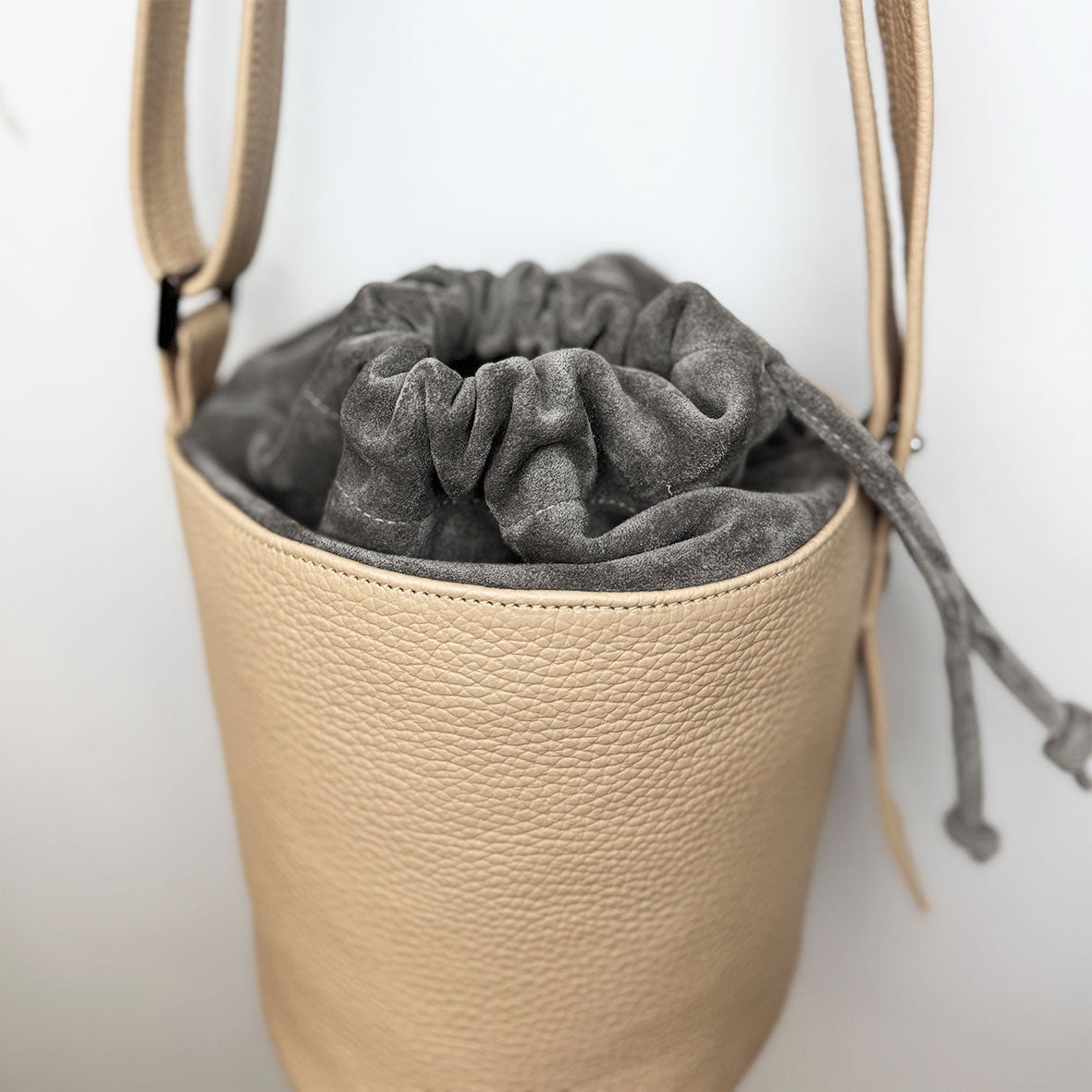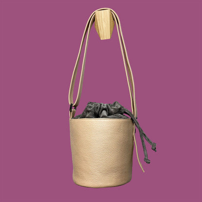 Elegante borsa in pelle. Il secchiello Lalla è con fondo circolare capiente e versatile. Tracolla regolabile in pelle.
