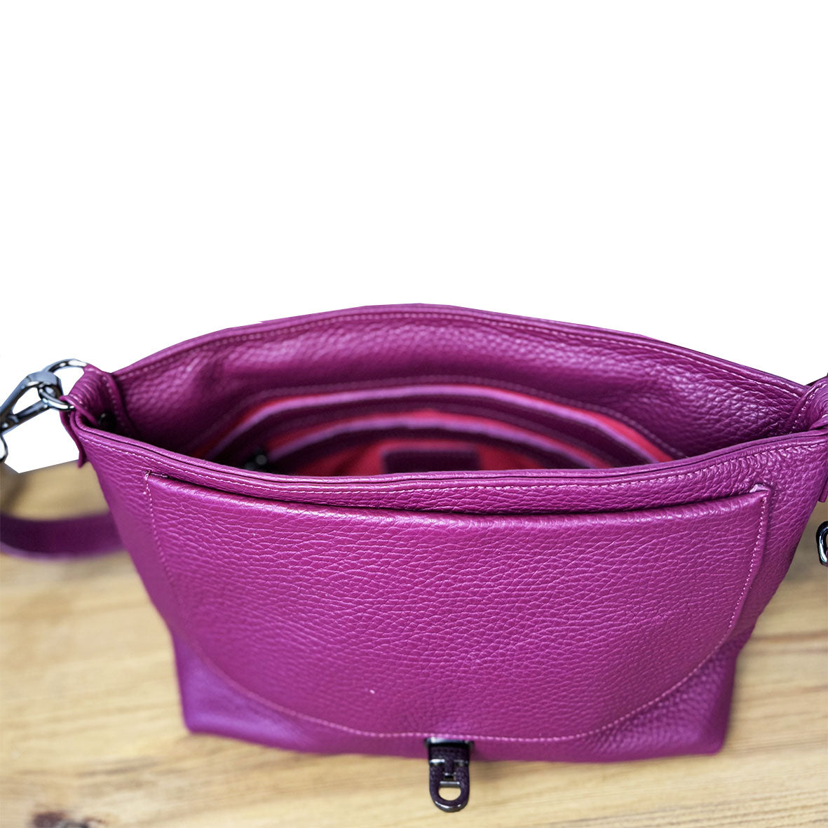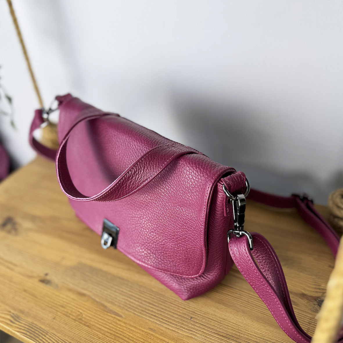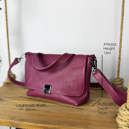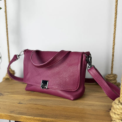 Elegante borsa in pelle con pattina e sotto patta in cotone Fuxia. La cartella Livia unisce praticità ed eleganza e risulta comoda per il lavoro e il tempo libero. Manico corto e Tracolla regolabile in pelle.
