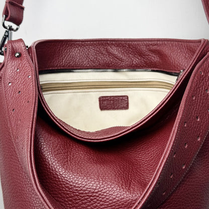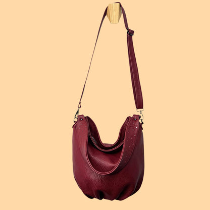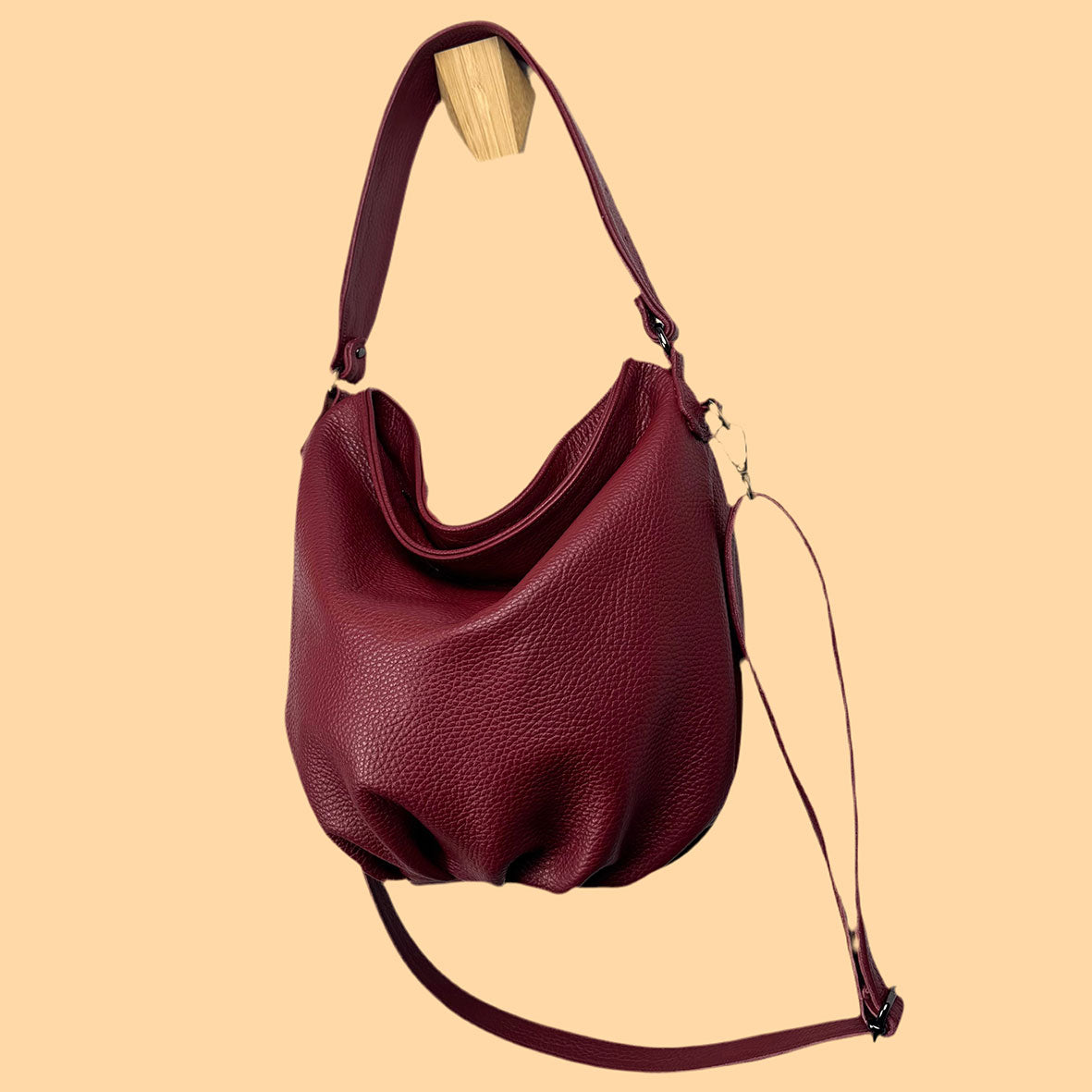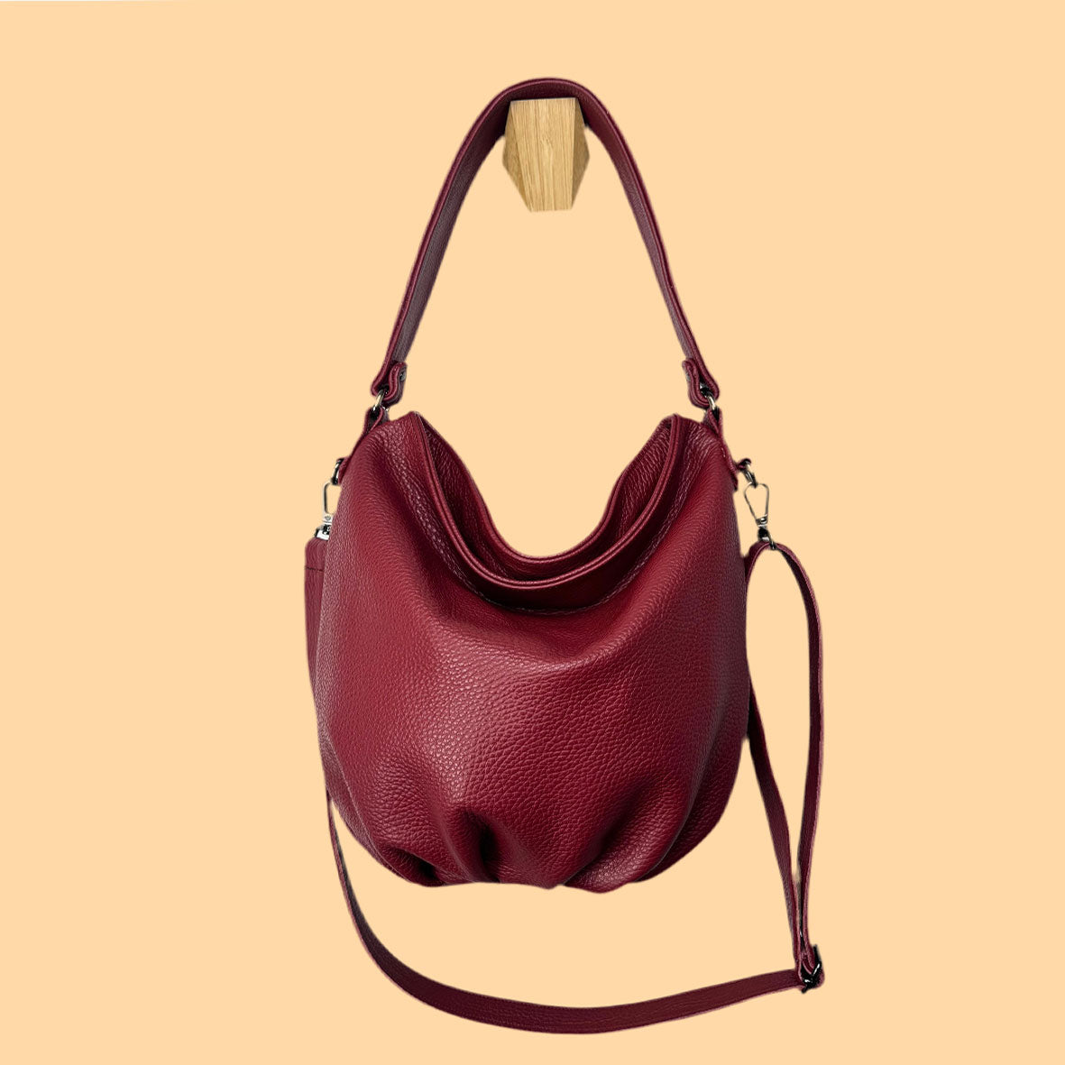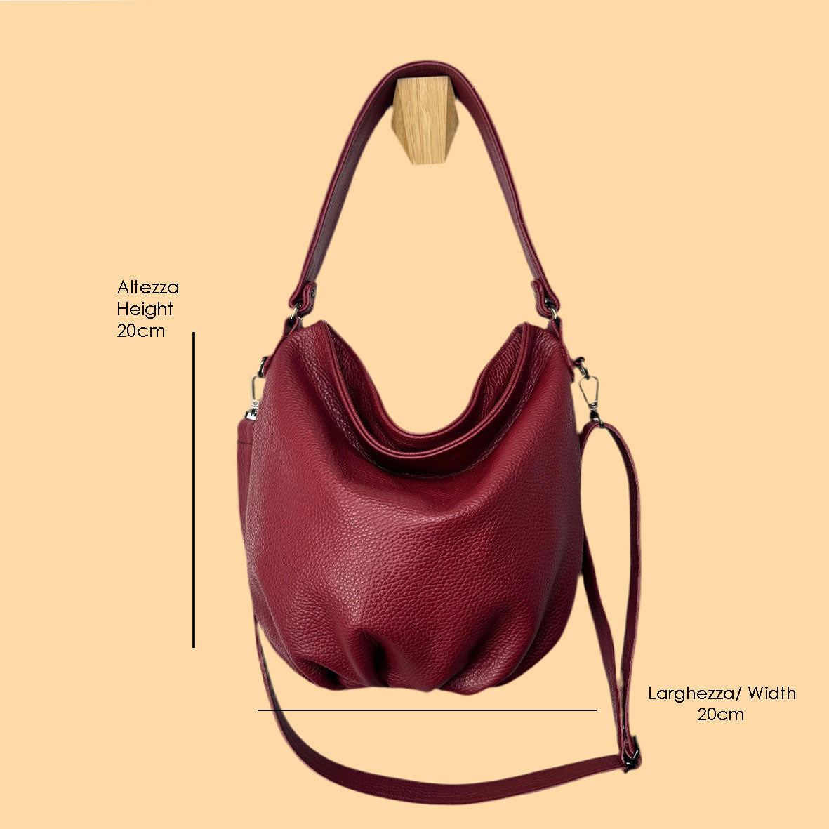 Elegant leather bag. Ludo is a roomy and versatile round bottom bag. Short handle and adjustable leather shoulder strap.