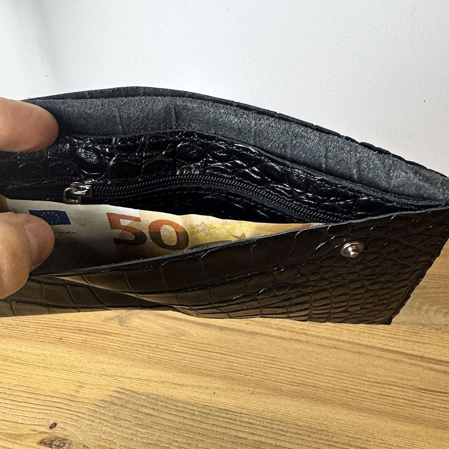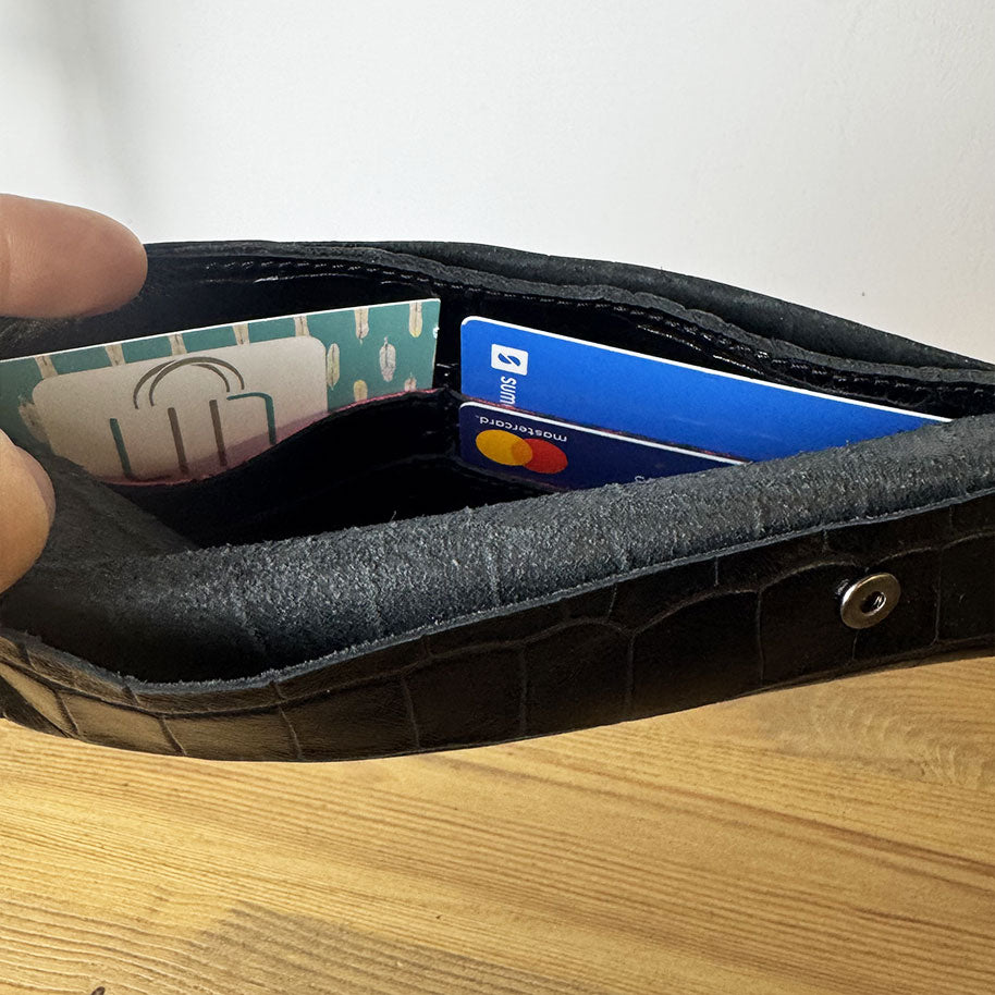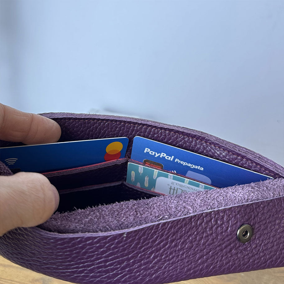 Descrizione: Portafogli in pelle destrutturato. Semplice funzionale e molto elegante, il nostro Anna Wallet ha 4 tasche porta card e una pochette interna porta spicci, può anche essere utilizzato come pochette inserendo dentro il cellulare.