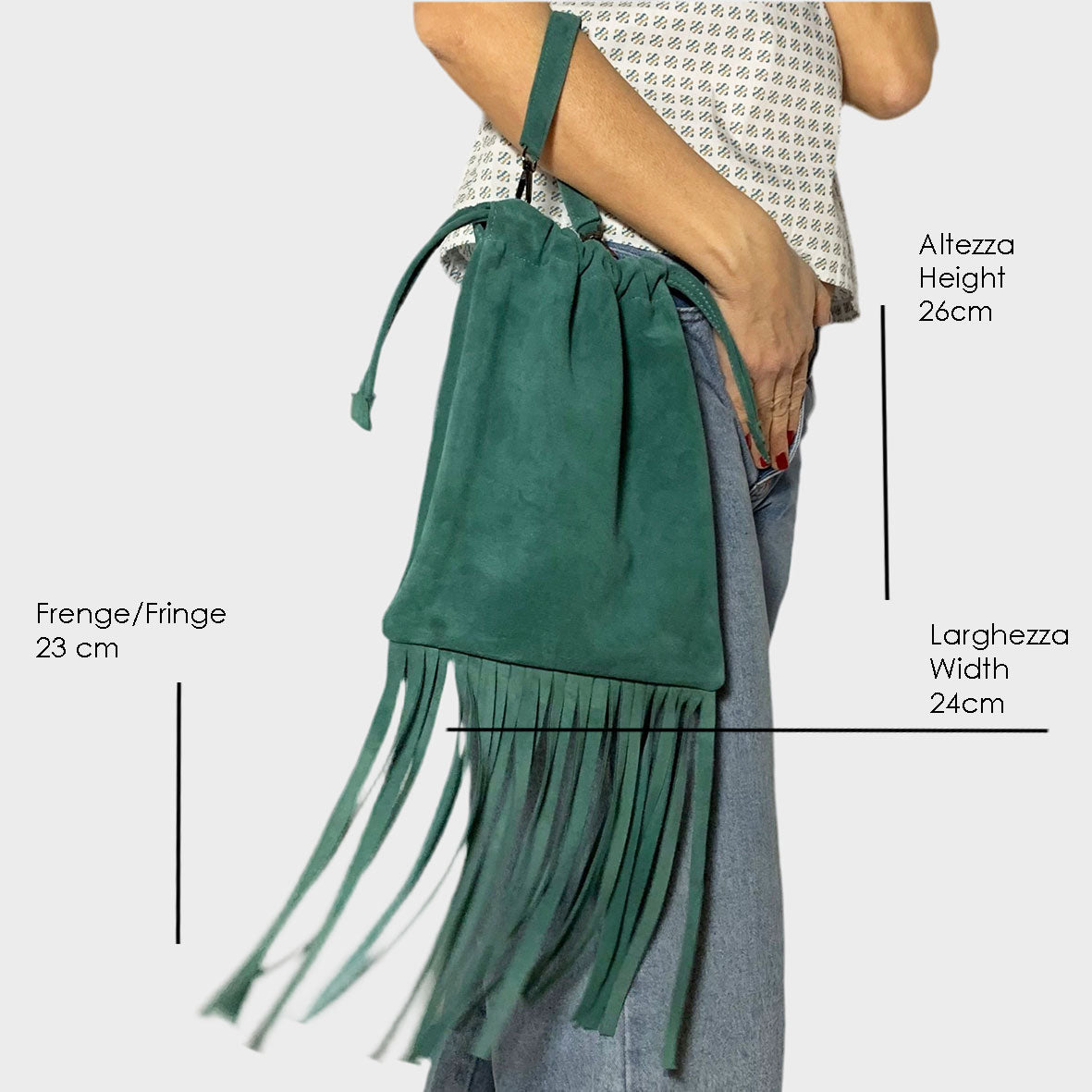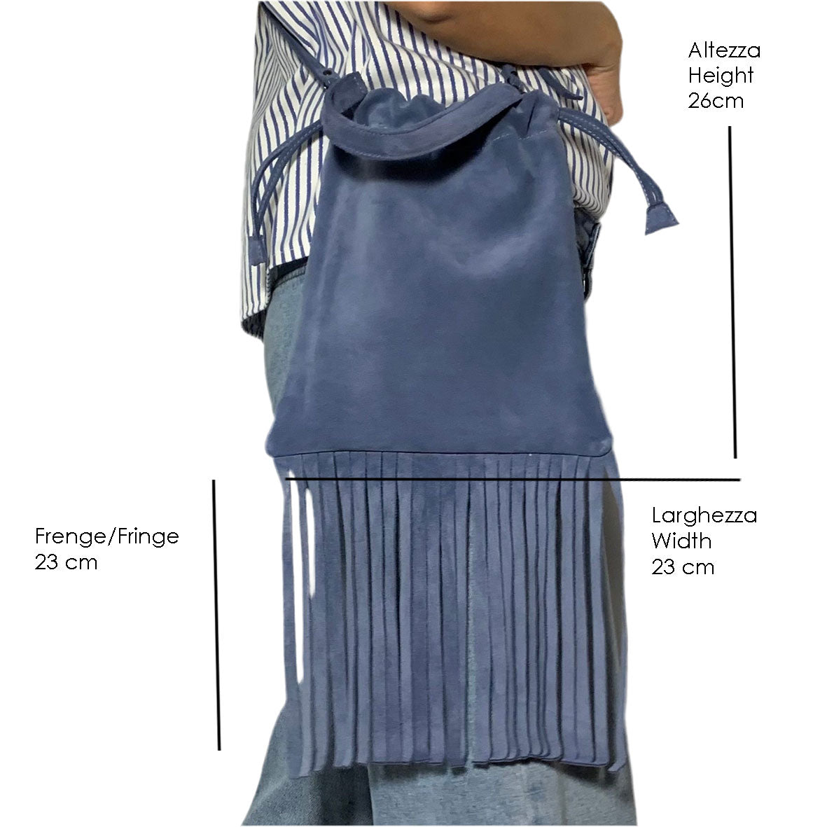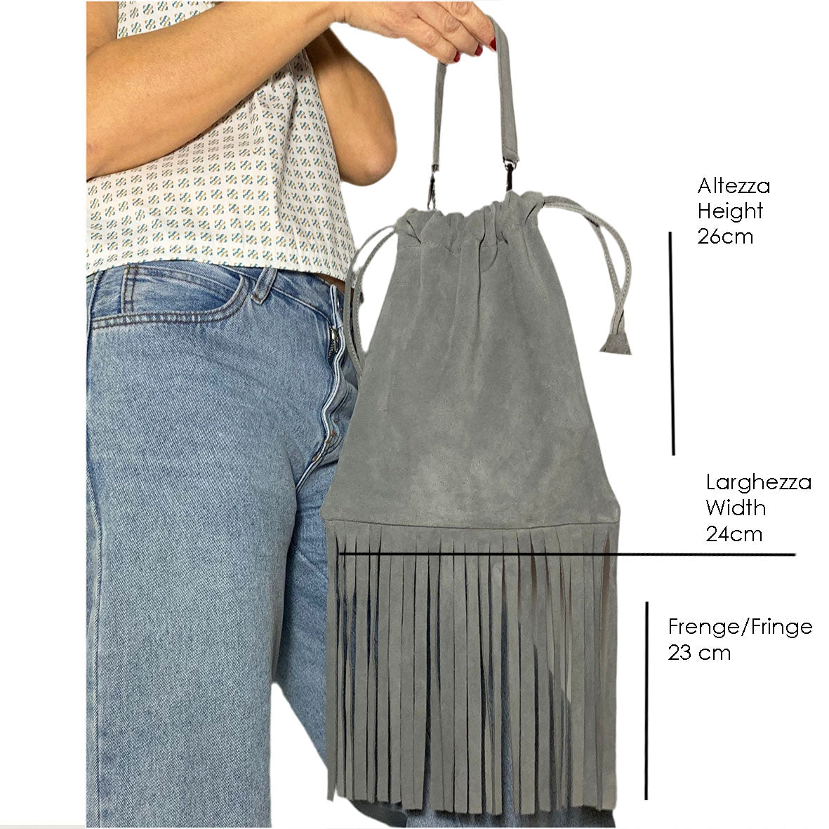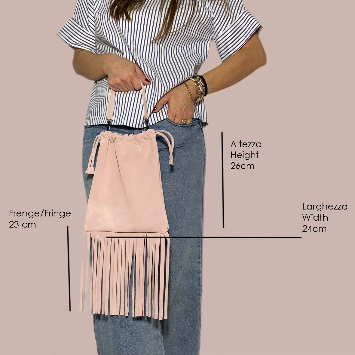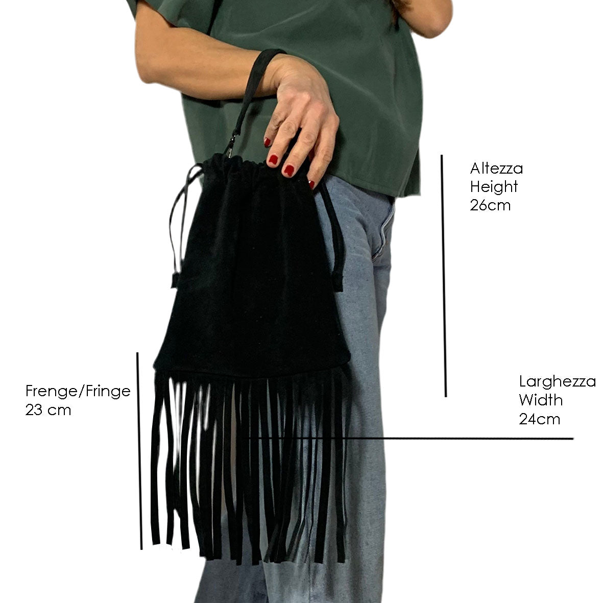 Attenzione: tutte le personalizzazioni a rilievo devono  essere acquistate tramite l’apposito modulo.  La borsa di base viene venduta solo con tracolla in catena per tracolla in pelle o per le frange devo essere selezionate a parte.