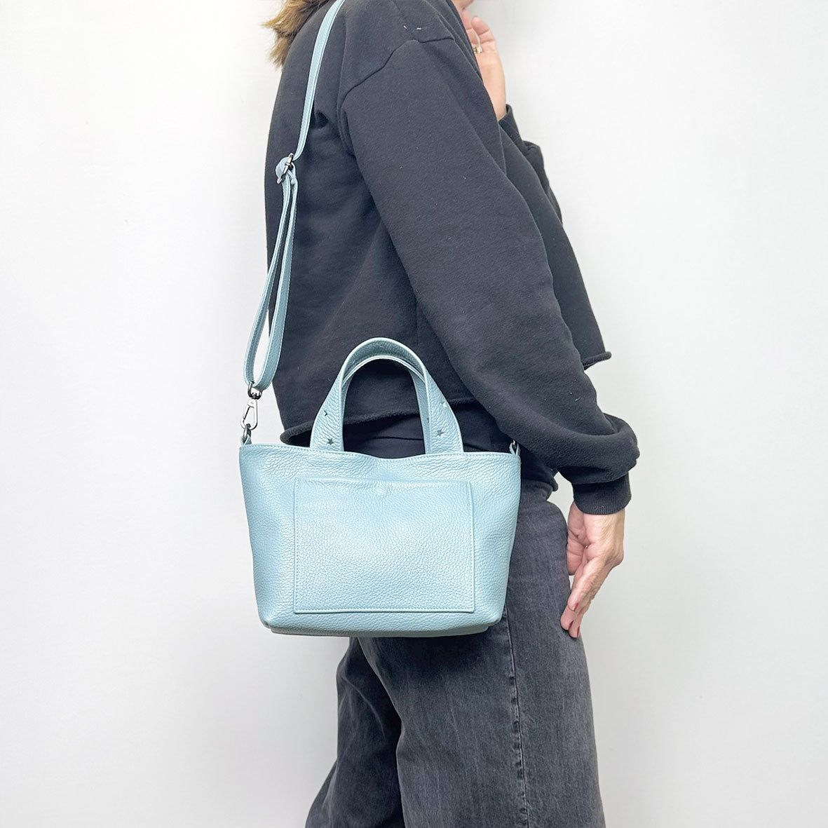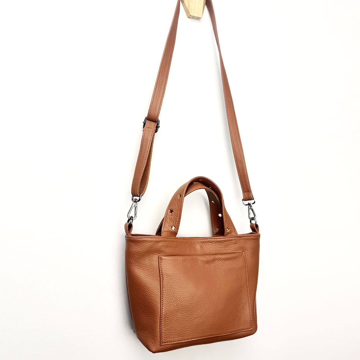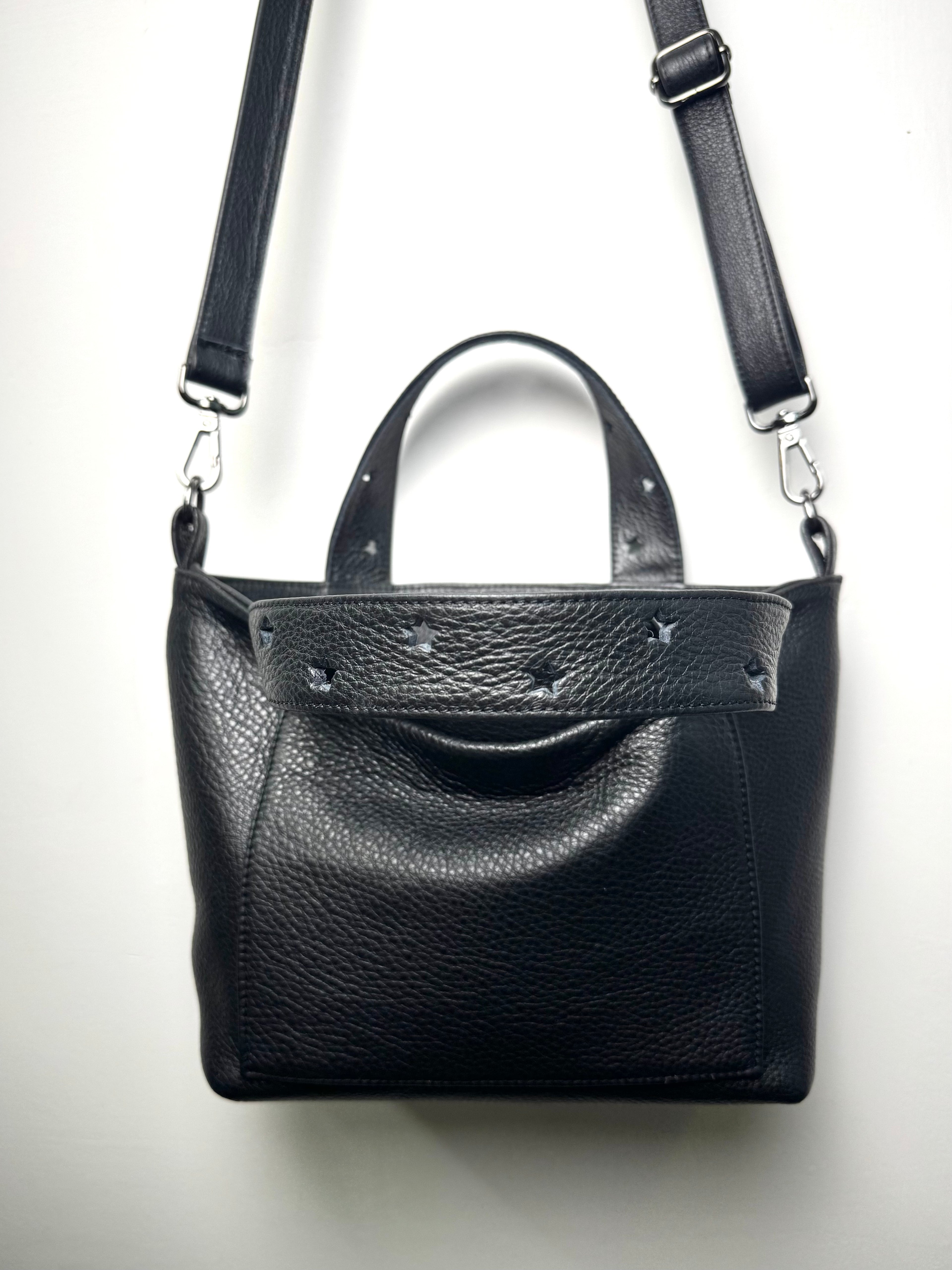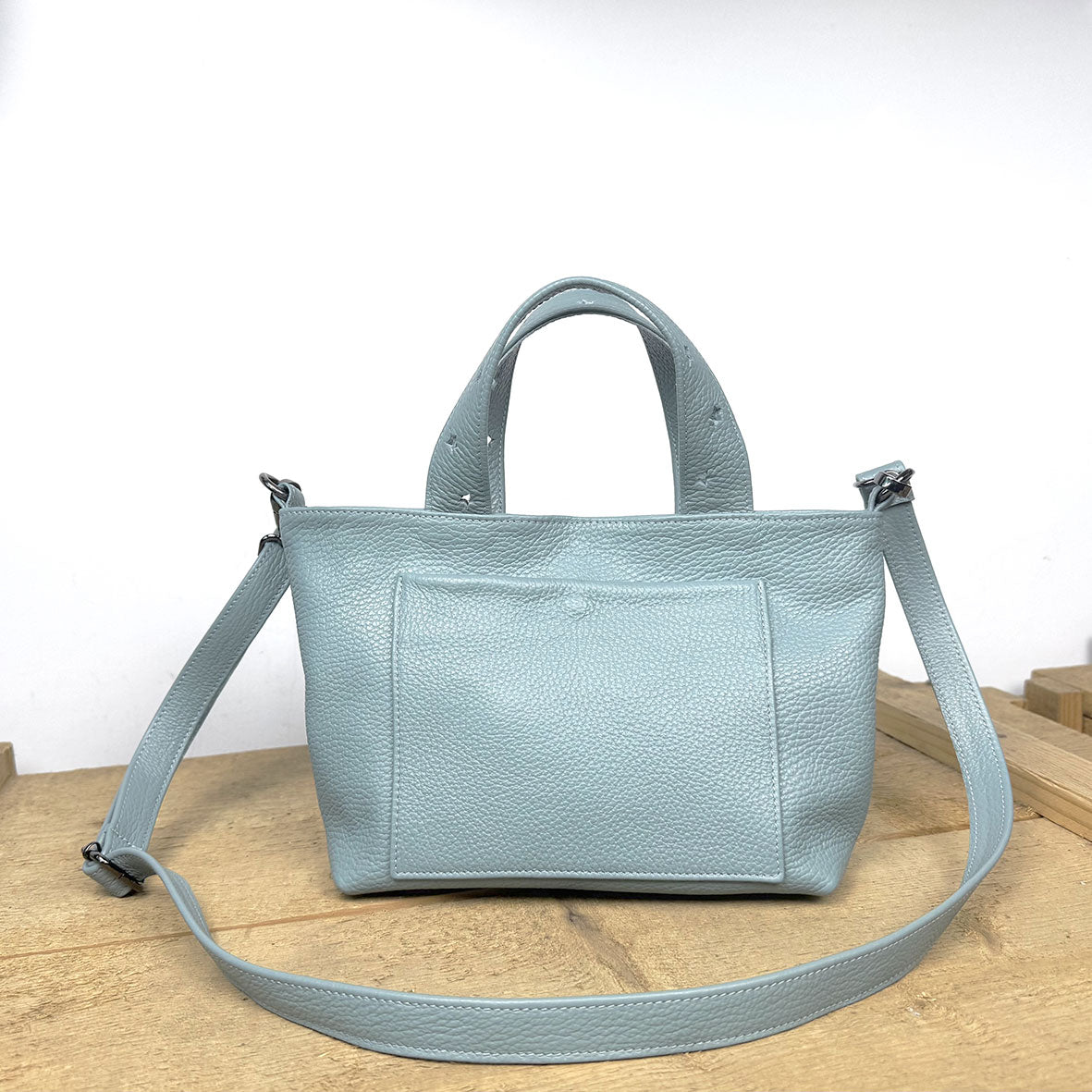 Elegante e versatile shopper in morbida pelle. Tasca esterna con bottone e tasca interna con zip.