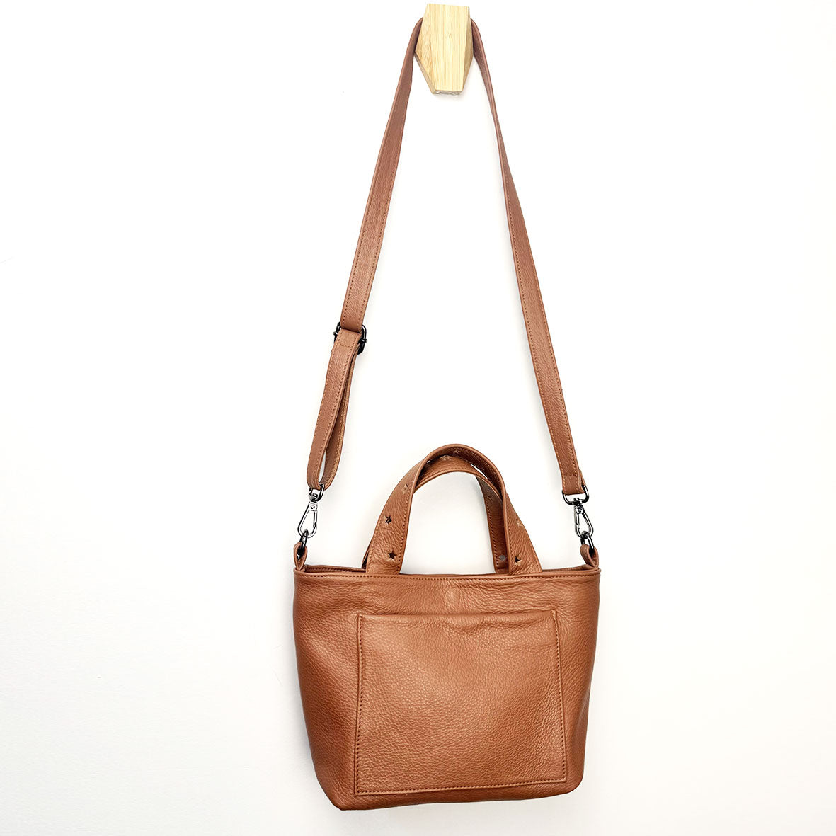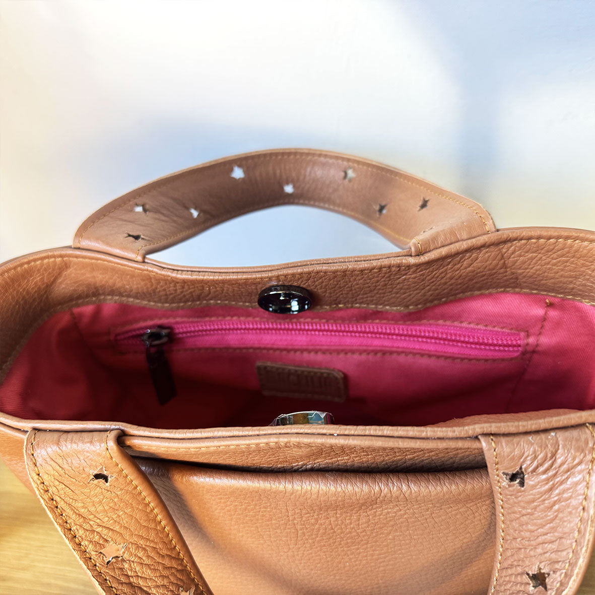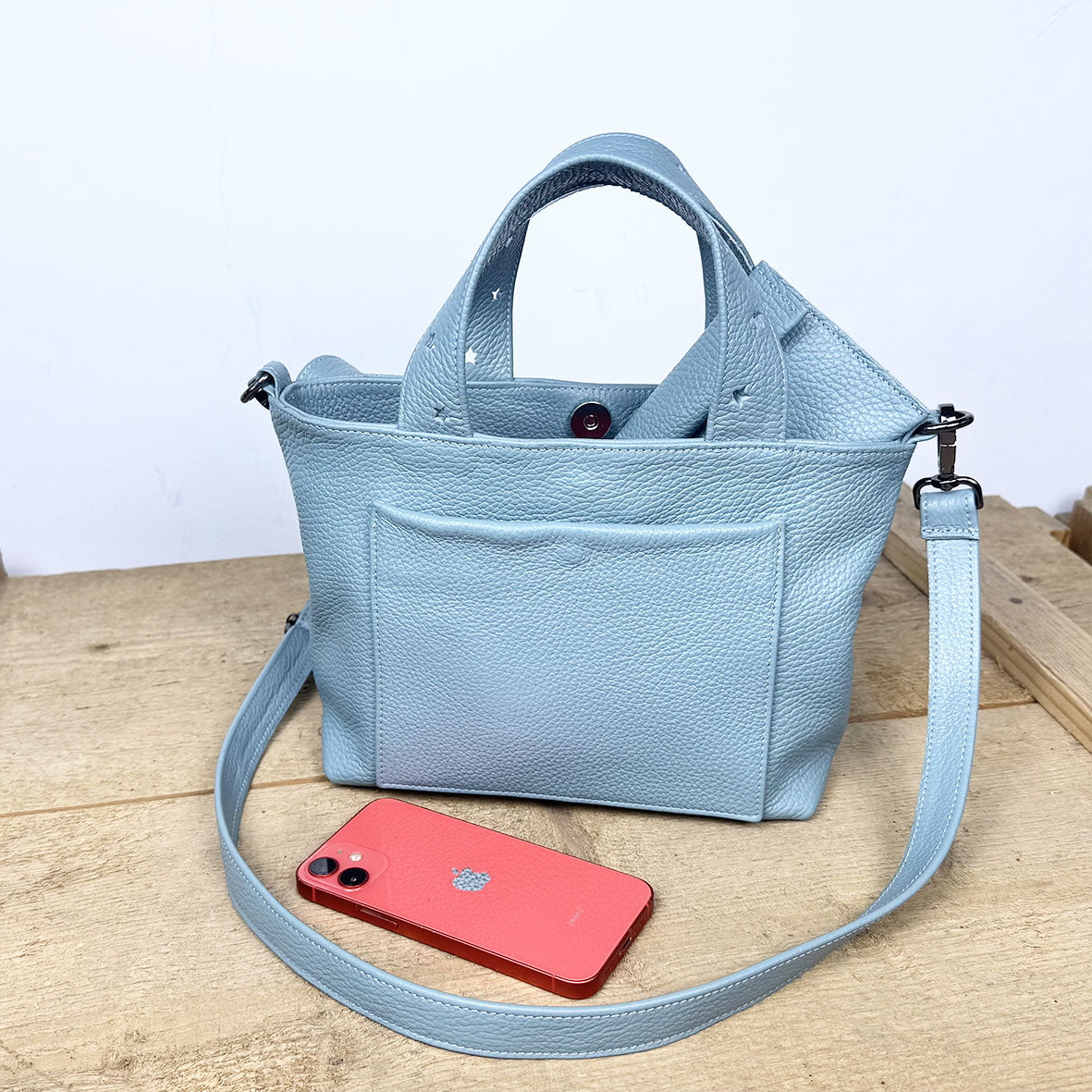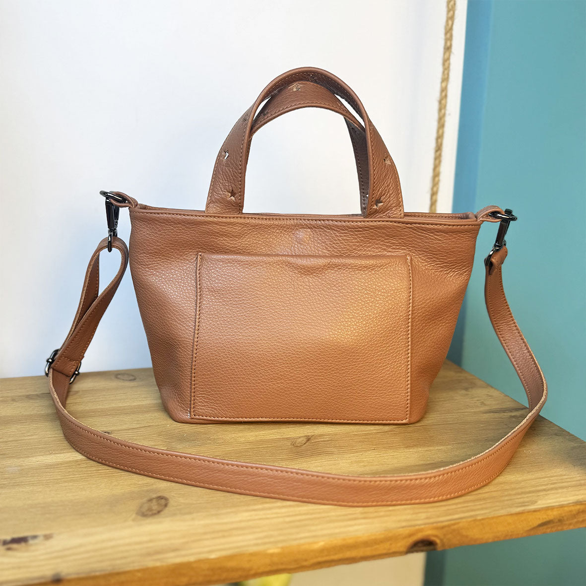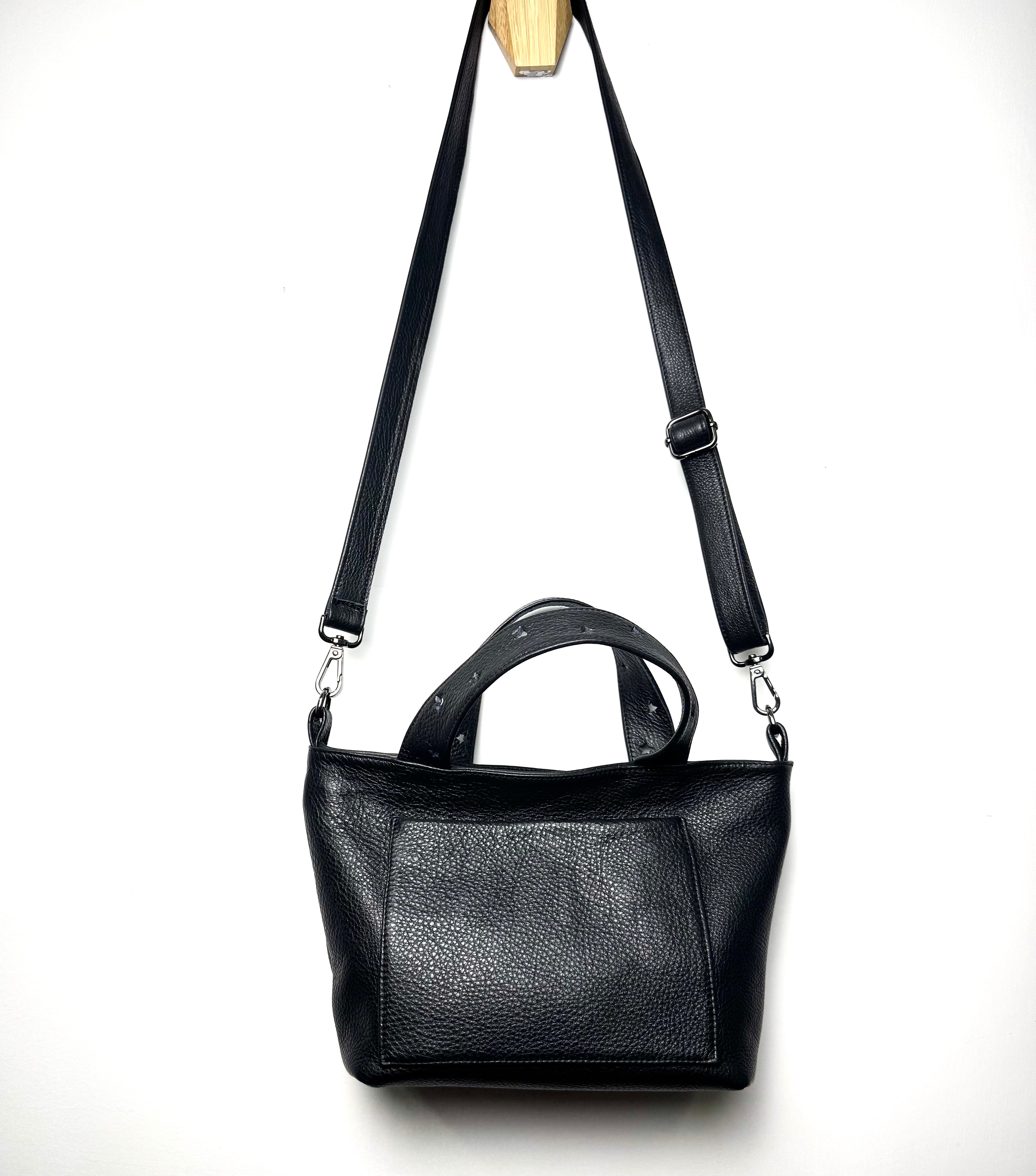 Elegante e versatile shopper in morbida pelle. Tasca esterna con bottone e tasca interna con zip.