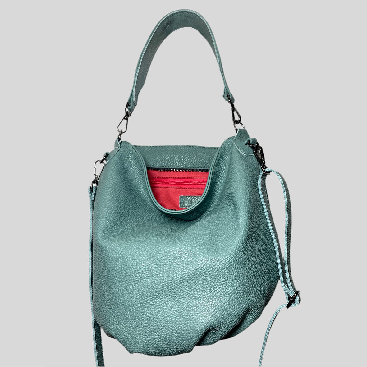 Elegante borsa in pelle. Ludo è un sacco con fondo circolare capiente e versatile. Manico corto e Tracolla regolabile in pelle.