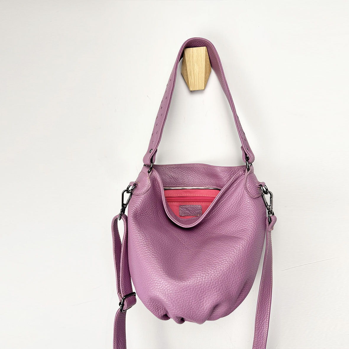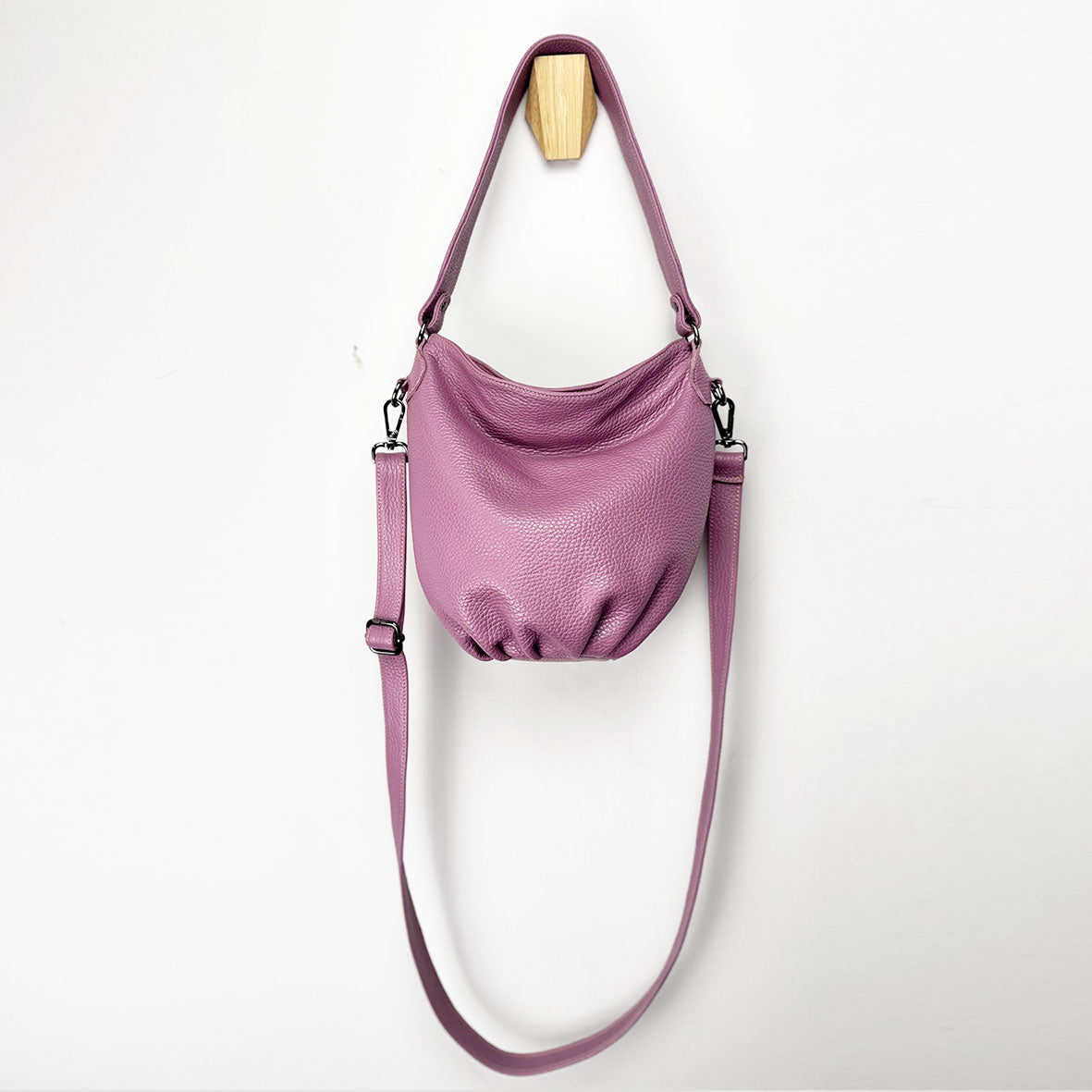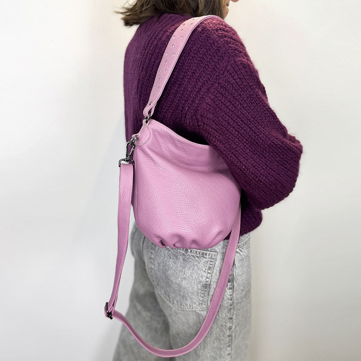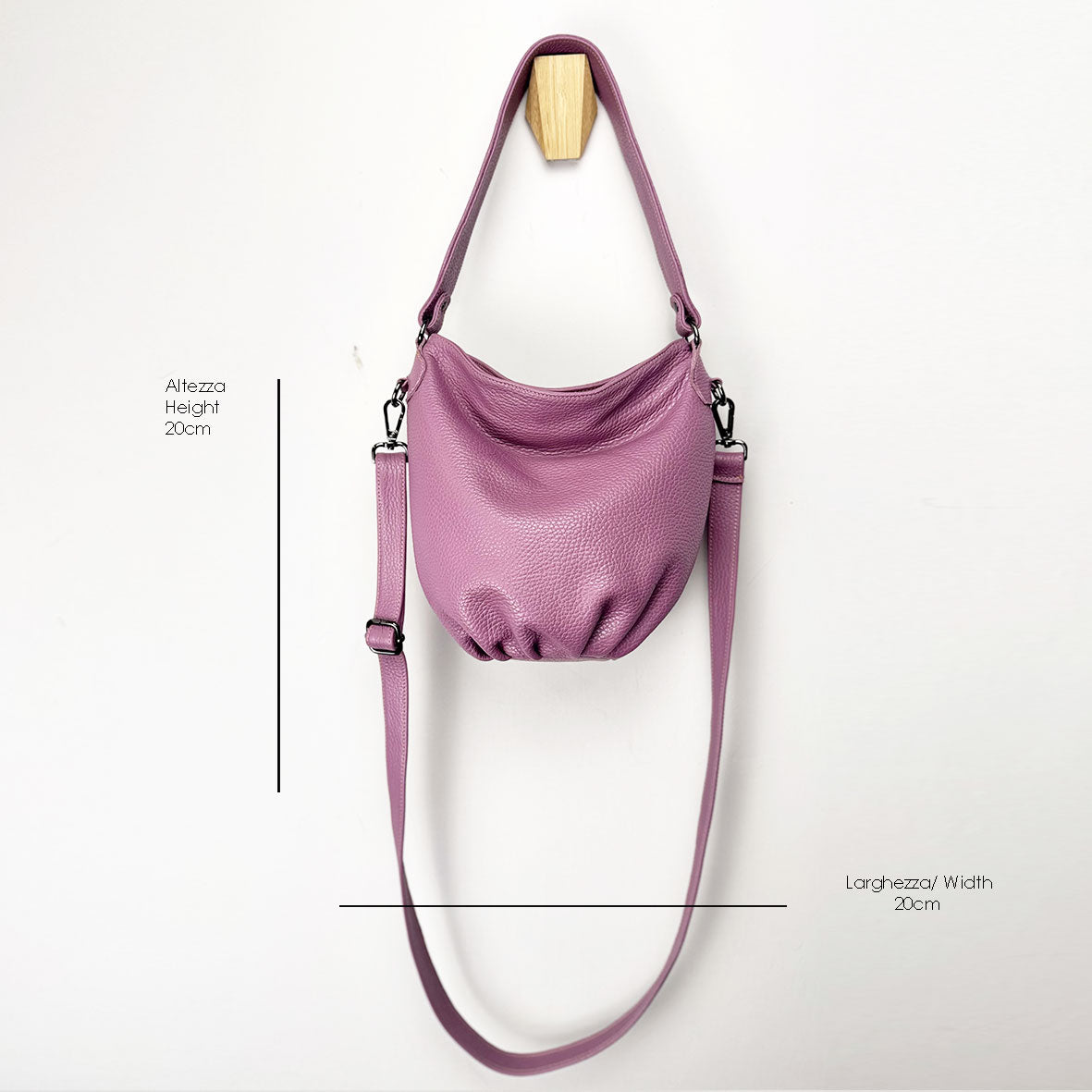 Elegante borsa in pelle. Ludo è un sacco con fondo circolare capiente e versatile. Manico corto e Tracolla regolabile in pelle.