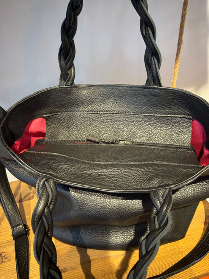 La shopper Traci è una capiente shopper con manici corti a treccia, tracolla lunga regolabile, chiusura con doppia zip per apertura centrale e tasca interna.